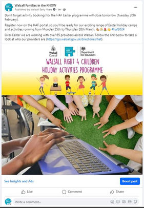 This page shows examples of social media posts I have created for Walsall Council's HAF (Holiday Activity & Food) Programme team on the Walsall Families in the Know Facebook page and Walsall Right 4 Children Twitter account.